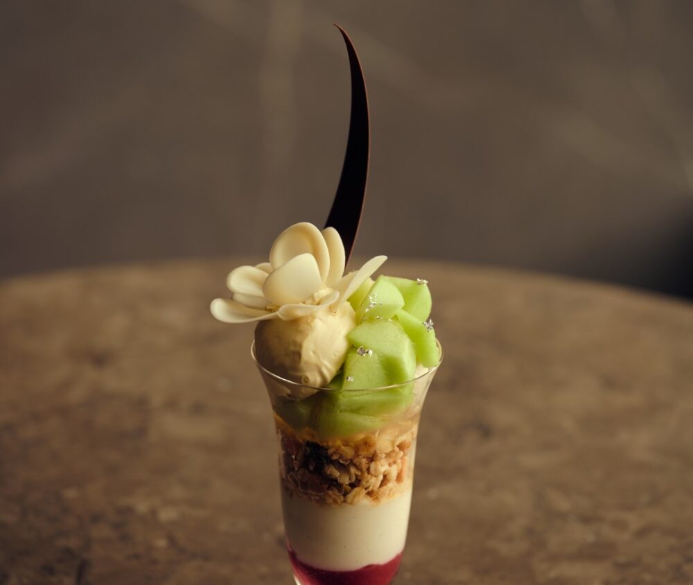 This season’s parfait creation celebrates Japanese Melon, layering smooth vanilla ice cream and refreshing lemon sorbet with crunchy textures for a playful contrast. Enjoy this artful dessert while taking in the evening views of Tokyo Tower and Azabudai Hills.