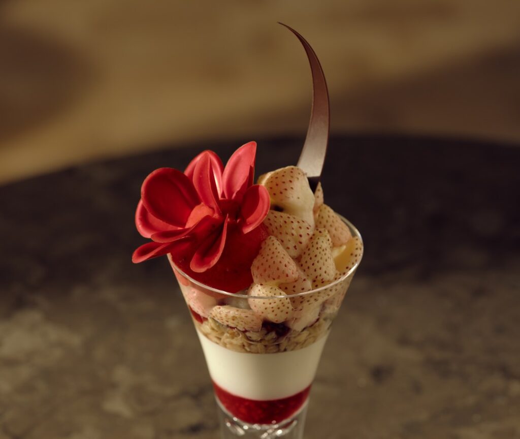 Janu Bar presents a seasonal parfait crafted with an abundance of fresh fruit. This season’s creation celebrates strawberries, layering smooth cream with crunchy textures for a rich and playful contrast. Enjoy this artfully composed dessert while taking in the evening views of Tokyo Tower.
