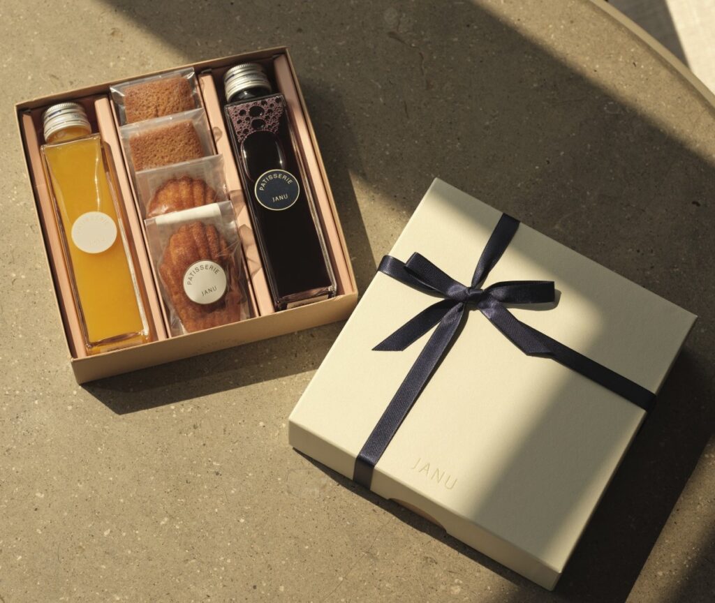 Janu Tokyo’s Original Gift Selection is the perfect treat for a loved one. Contents include soft honey madeleines, financiers enriched with brown butter and almonds, accompanied by a choice of juices from Tanii Farm.